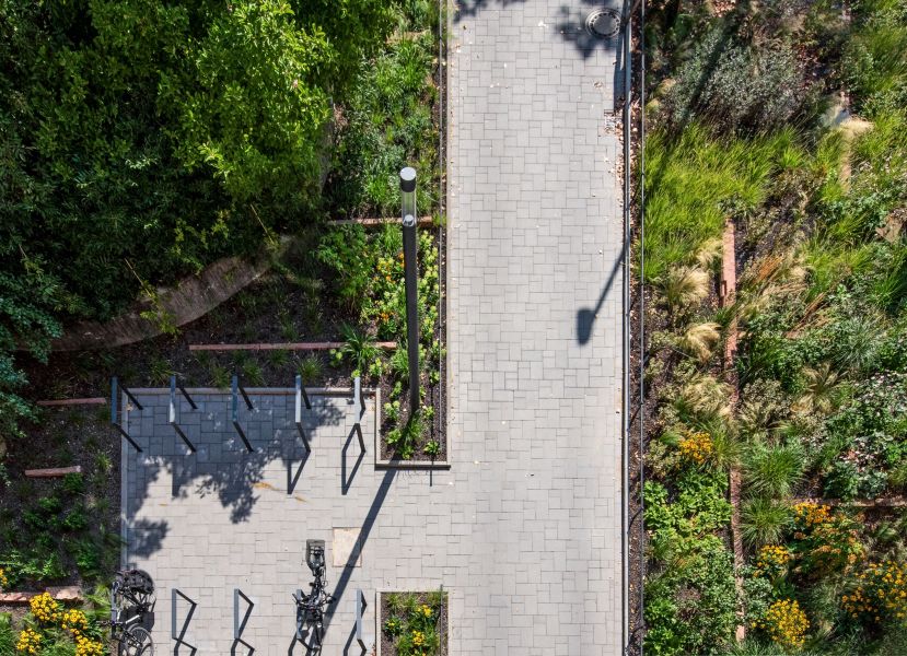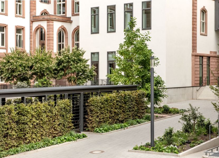 Es wurden einige Parkplätze und zahlreiche Fahrradstallplätze, z.T. überdacht, abschließbar und mit E-Bike Ladestation, integriert. Ein Beleuchtungskonzept aus energiesparenden LED-Mastleuchten, Boden- und Wandeinbaustrahlern sorgt auch bei Dunkelheit für die nötige Sicherheit, eine optimale Ausleuchtung und eine optisch ansprechende Lichtsituation.