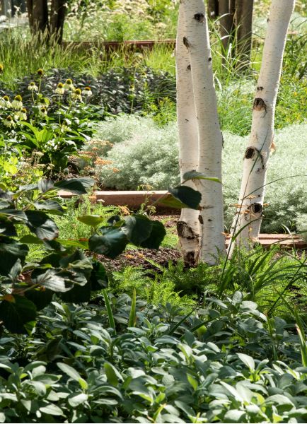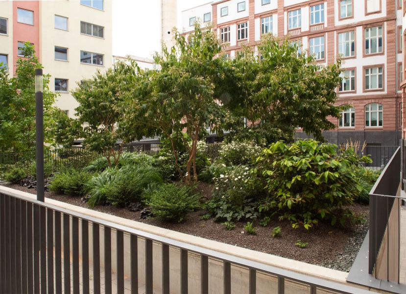 Zukünftig sollen die Höfe neben ihrem rein funktionalen Charakter auch als Aufenthalts- und Kommunikationsorte für die Mitarbeiter etabliert werden. Dazu wird jeder Hof mit einem großen, hochstämmigen Laubbaum verschiedener Arten bepflanzt. Der unterschiedliche Habitus eines jeden Baumes setzt Akzente und Sitzbänke unter den Bäumen laden zum Verweilen ein. Um ein durchgängig begrüntes Hofambiente zu schaffen und die Aufmerksamkeit von den technischen Einrichtungen abzulenken, werden z.B. Müllcontainer mit Hecken umpflanzt. Die neue Außenterrasse des Senckenberg-Museums bekommt ein vorgelagertes Pflanzbeet als Einfassung.