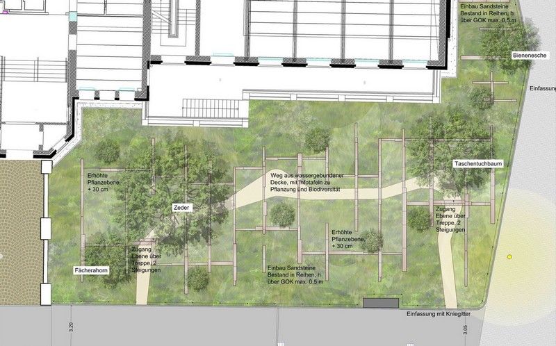 Die Freiflächenplanung verfolgt dabei das Ziel, die Vegetationsflächen sowohl in ihre ökologische Funktion als Lebens- und Nahrungsraum, als auch in ihrer gestalterischen Qualität nachhaltig zu erhöhen – und damit eine identitätsstiftende Freiflächengestaltung für das Senckenberg-Gelände zu erreichen.