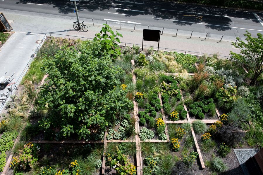 Die Biodiversität, das Leitmotiv der Forschung bei Senckenberg, wird bei der Gestaltung der Vegetationsflächen außerhalb der Innenhöfe mit einbezogen und unter anderem durch die Anlage eines Insektengartens thematisiert. Auf 2.770 m² wird statt steriler Rasenflächen eine auf die Architektur abgestimmte, strukturierte Bepflanzung aus Stauden, Sträuchern und Bäumen die Außenanlagen aufwerten.