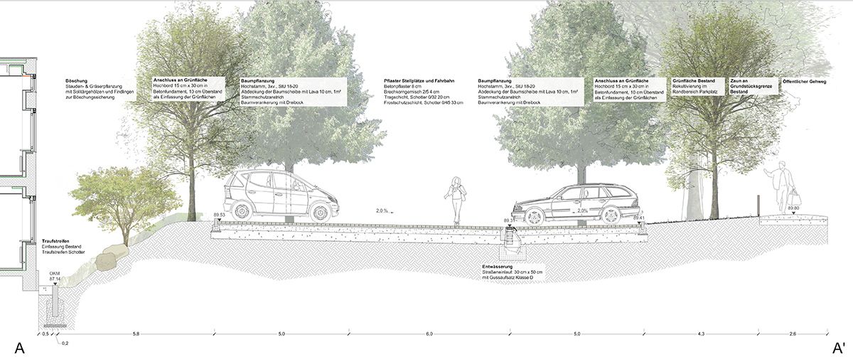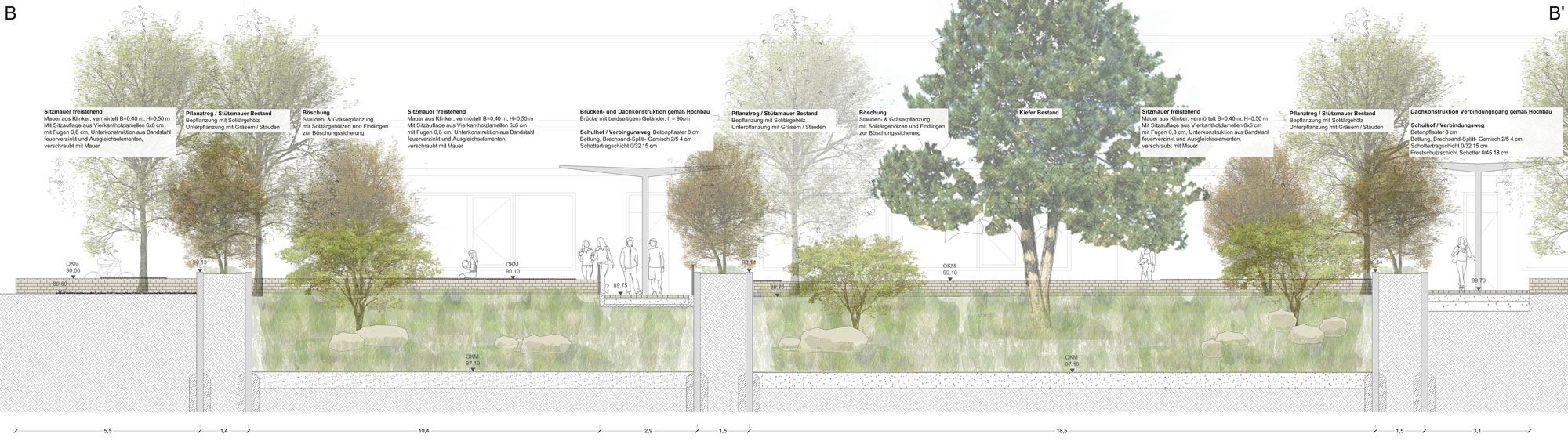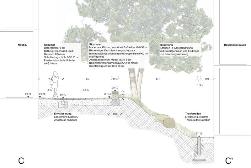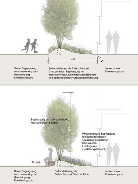 Der neue Schulhof zwischen Erweiterungsbau und Bestandsgebäude wird mit Betonpflaster und wassergebundener Decke befestigt. Es werden Sitzangebote in Form von geschwungenen Mauern errichtet und mit Sitzauflagen aus Holz ausgestattet. Sie dienen gleichzeitig als Begrenzung der Grünflächen gegenüber dem Pflaster. Die neue Schulhoffläche zwischen Alt- und Neubau wird als begrünter Schulhof konzipiert und ebenfalls mit Bäumen und Sträuchern bepflanzt. Als Unterpflanzung werden robuste bodendeckende Gräser bzw. Rasenflächen angelegt. Eine von den Schülern selbst errichtete Aufenthaltsfläche „Pla-Chill“ wird vor Beginn der Bautätigkeiten abgebaut, eingelagert und später in leicht veränderter Form wieder aufgestellt. Rund um den Neubau werden neue energiesparende LED-Mast-Leuchten errichtet.