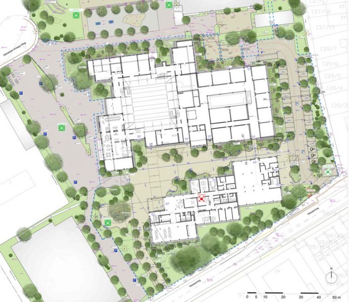 Die PGNU wurde mit der Freianlagenplanung des durch den Neubau neu entstehenden Schulhofes, der Sanierung der Freiflächen des Bestandsschulgebäudes, sowie eines Freiraumplanerisches Gesamtkonzeptes für das gesamt Schulgelände beauftragt. Dies umfasst auch die Errichtung eines Parkplatzes mit 29 PKW-Stellplätzen sowie die Neuerrichtung von 490 Fahrradstellplätzen. Darüber hinaus wurde bei der Erstellung eines Interimskonzeptes (Errichtung einer Containeranlage zur Nutzung als Klassenräume während der Bauzeit sowie temporären PKW-Stellplätzen) sowie bei der Planung eines Trafo-Neubaus und der erforderlichen Versorgungsleitungen mitgewirkt. Außerdem wurden durch die PGNU Baumfällgenehmigungen erarbeitet, die Baumfällarbeiten Anfang 2018 überwacht sowie die Ersatzpflanzungen geplant und mit der UNB abgestimmt.