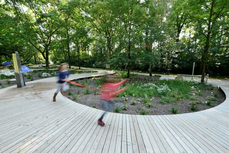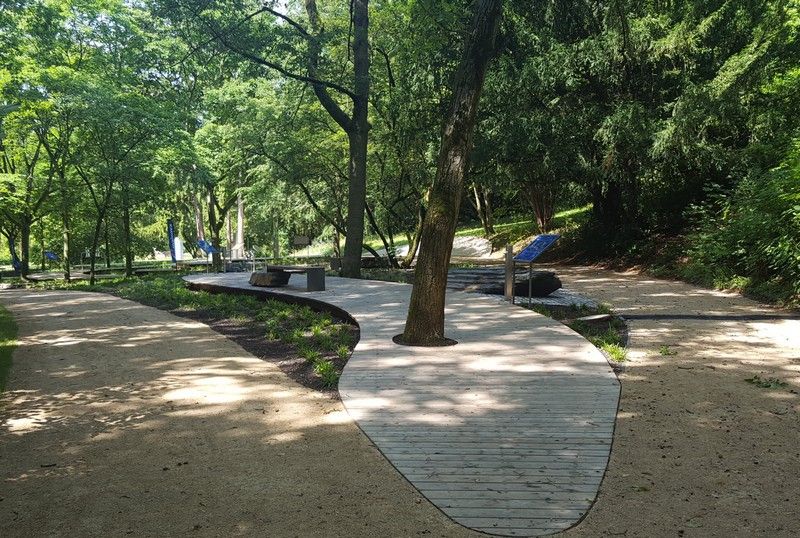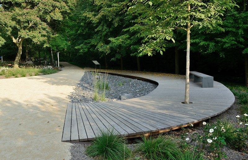 Das verbindende Element des Lehrpfades ist ein 3 m breiter und 180 m langer, geschwungener Steg aus Lärchenholz, der in seiner Form einem mäandrierenden Wasserlauf nachempfunden wurde und sich zwischen zahlreichen bestehenden Bäumen über verschiedene Höhen hindurch schlängelt. Der Steg wurde mitsamt der hölzernen Unterkonstruktion oberirdisch, optisch nahezu schwebend, angelegt um aufgrund der starken Durchwurzelung Bodeneingriffe zu vermeiden.
