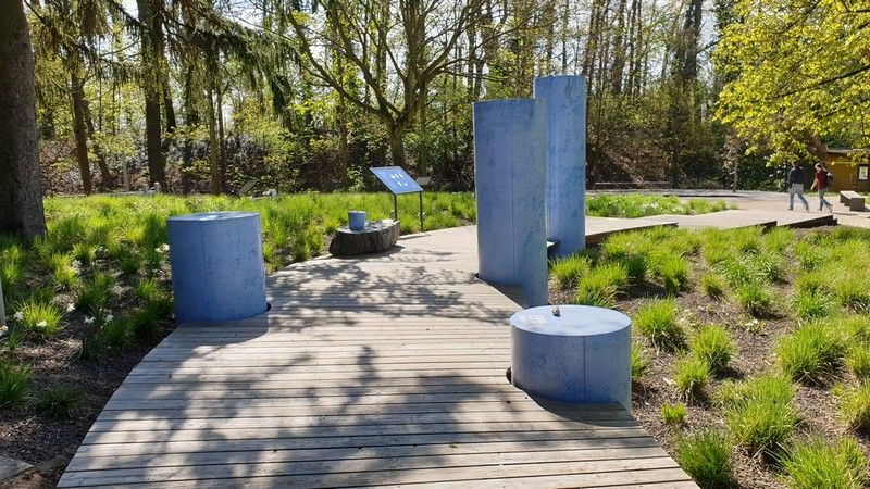 Neben dem Holz des Steges bilden Steine und Findlinge das zweite wichtige Gestaltungsmaterial mit einer Analogie zu einem Fluss-/Bachbett. Ein großer sprudelnder Quellstein an einem Ende des Steges symbolisiert gleichsam den Beginn des Weges, den das Trinkwasser auf seiner Reise zum Endverbraucher antritt. Die neben den Stationen auf dem Steg verorteten Sitzbänke wurden eigens für den Lehrpfad entworfen, jeweils eine Seite wurde in einen Steinquader eingelassen. Ein „Trockenbachbett“ dient gleichzeitig als Entwässerungsmulde und wurde wie ein steiniger Gebirgsfluss mit kleinen Steinplatten ausgekleidet. Gräser- und Staudenpflanzungen beidseits des Pfades runden das Konzept ab und unterstreichen die naturnahe Gestaltung.